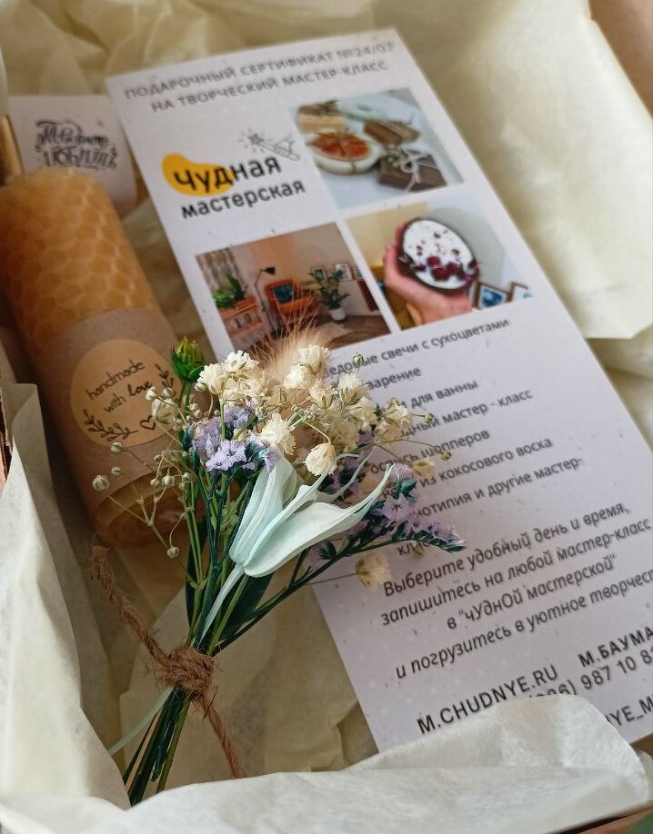 Дополнительно в финале программы создадим ароматное восковое саше. Работы будут долго радовать своей эстетикой и стойким ароматом. Продолжительность программы - 90-120 минут. Мастер-класс проходит в группах до 8 участников. Можно с детьми от 6 лет.